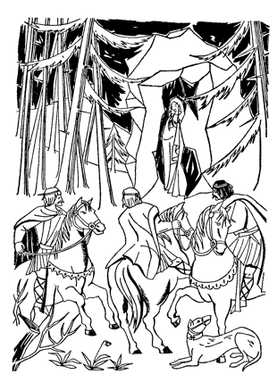 Cuando la familia, invitados y sirvientes se durmieron, salió de su habitación con mil precauciones, y como su valiente nodriza debió hacer veinte años atrás, afrontó sola los peligros del bosque en la noche. Se había envuelto en un modesto manto de color oscuro bajo el que disimulaba un pequeño hatillo.